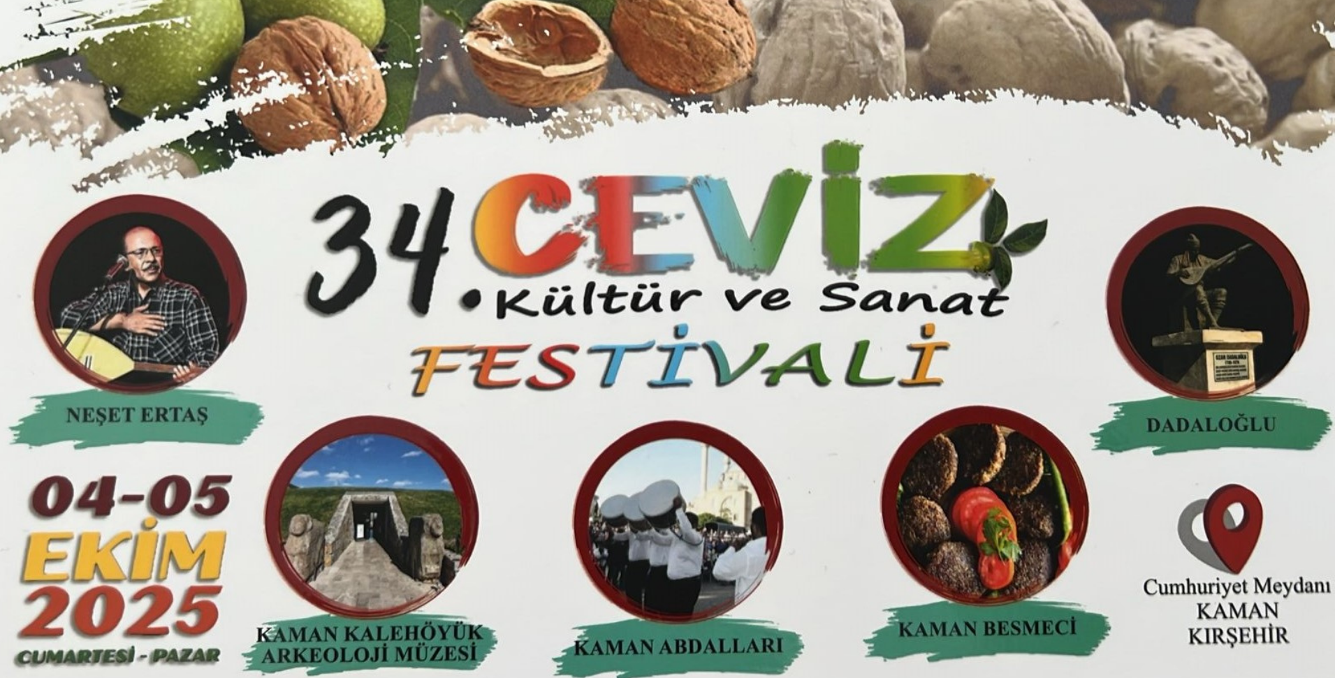 Kaman Belediyesi tarafından düzenlenen 34. Ceviz Kültür ve Sanat Festivali, 4-5 Ekim 2025 tarihlerinde gerçekleştirilecek.