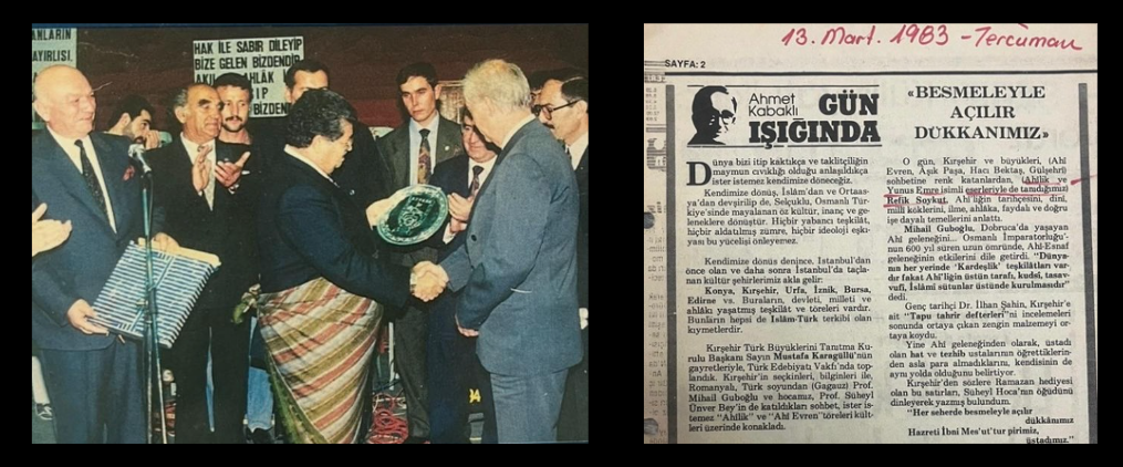 “…Kırşehir Türk Büyüklerini Tanıtma Kurulu Başkanı Sayın Mustafa Karagüllü’nün gayretleriyle, Türk Edebiyat Vakfı’nda toplandık. Kırşehir’in seçkinleri, bilginleri ile Romanyalı, Türk soyundan (Gagauz) Prof. Mihail Guboğlu ve hocamız Prof. Süheyl Ünver Bey’in de katıldıkları sohbet, ister istemez “Ahilik” ve “Ahi Evren” töreleri kültürü üzerinde konakladı. Prof. Dr. Fuat Köprülü, aynı zamanda manevi, ahlâkî, tasavvufî ve İslâmî derinlikte bir teşkilat olan Ahiliğin, Osmanlı Devleti’nin kurulma ve yaşamasındaki önemini anlatırken şunları söylüyor: