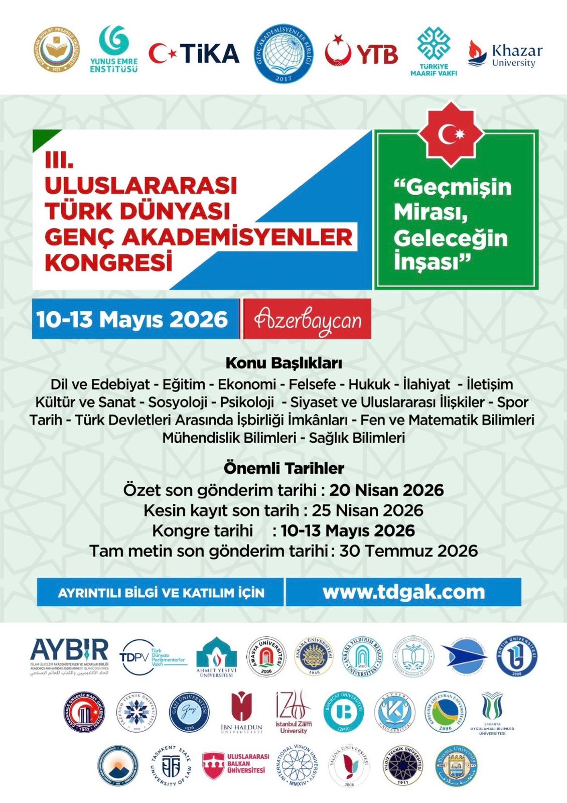 Türk dünyasından genç akademisyenleri bir araya getirecek olan III. Uluslararası Türk Dünyası Genç Akademisyenler Kongresi, 10-13 Mayıs 2026 tarihleri arasında Azerbaycan’da gerçekleştirilecek.