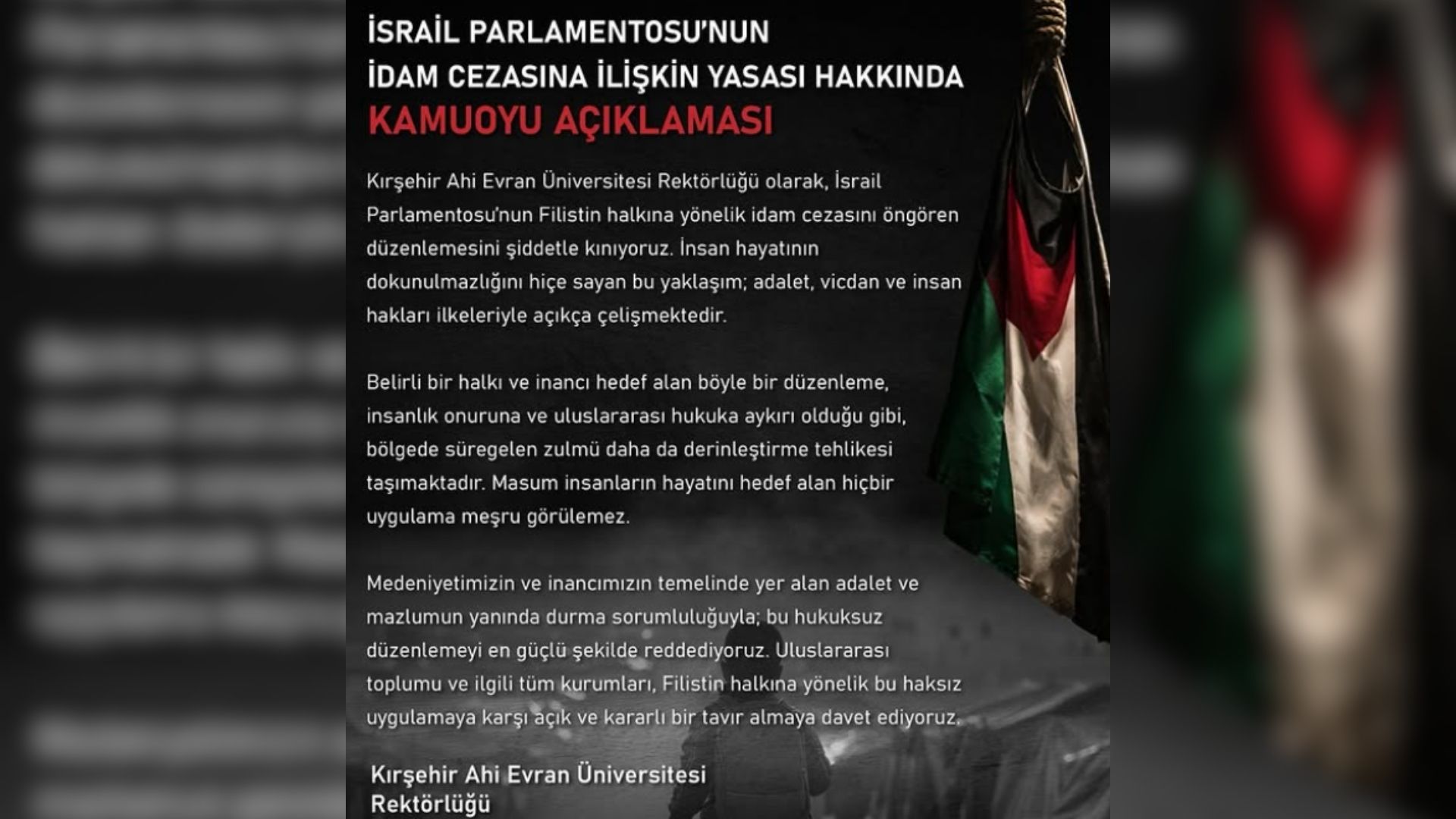 Kırşehir Ahi Evran Üniversitesi (KAEÜ) Rektörlüğü, İsrail Parlamentosu’nun Filistin halkına yönelik idam cezasını öngören yasa düzenlemesine ilişkin yazılı bir kamuoyu açıklaması yayımladı. Açıklamada, söz konusu düzenleme sert ifadelerle kınanırken, insan hayatının dokunulmazlığını hiçe sayan bu yaklaşımın adalet, vicdan ve insan hakları ilkeleriyle açıkça çeliştiği vurgulandı.