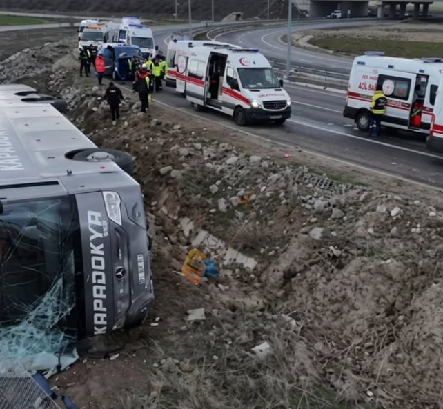 Nevşehir’den Ankara güzergahı üzerinden İzmir’e gitmek üzere yola çıkan, Kapadokya Vip firmasına ait otobüsün sürücüsü virajı alamayınca araç kontrolden çıkarak devrildi.